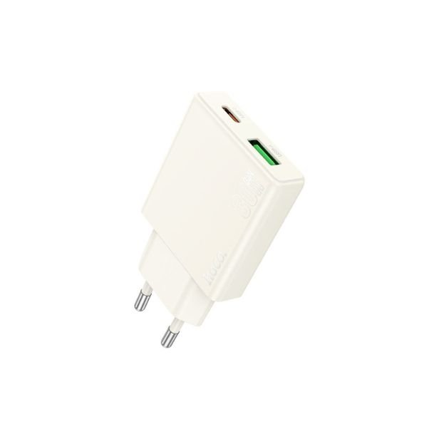 El cargador de pared Hoco N45 PD30W + QC3.0 es un adaptador compacto diseñado para brindar carga rápida eficiente y segura a múltiples dispositivos desde una toma de corriente con enchufe EU. Utiliza tecnología GaN (Nitruro de Galio), lo que le permite alcanzar altas potencias de salida manteniendo un tamaño reducido y menor generación de calor durante su operación. Cuenta con dos puertos de salida: un USB‑C de hasta 30 W, compatible con protocolos de carga rápida Power Delivery (PD30W), PPS, Quick Charge 3.0 (QC3.0), FCP y AFC, y un USB‑A que puede entregar hasta 18 W bajo QC y otros estándares rápidos. Esto permite cargar dos dispositivos a la vez (por ejemplo, un smartphone y una tablet o auriculares) con velocidades optimizadas según cada dispositivo. Su diseño es ligero (≈50 g) y compacto (86 × 46 × 14 mm), ideal para llevar en una mochila o equipaje sin ocupar espacio. La carcasa está fabricada con material PC retardante de llama, lo que mejora su durabilidad y seguridad contra sobrecalentamientos y cortocircuitos. Este cargador es una excelente opción para usuarios que necesitan potencia de carga rápida en casa, oficina o viaje, sin necesidad de accesorios adicionales como cables incluidos.